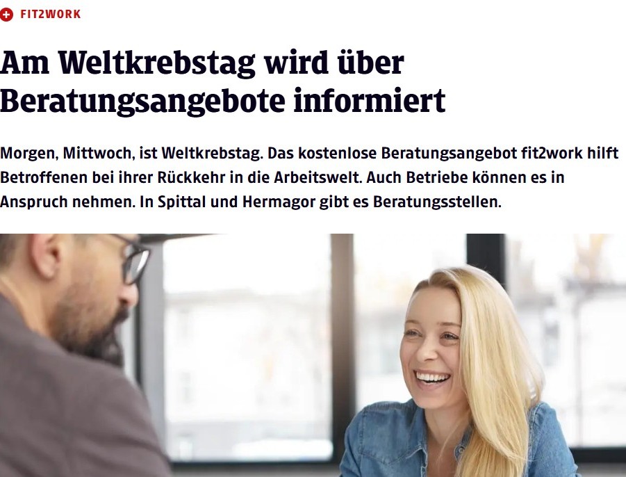 Anlässlich des Weltkrebstages am 04.02. berichtete die Kleine Zeitung über das Angebot von fit2work. Unser kostenloses Beratungsangebot hilft Betroffenen bei ihrer Rückkehr in die Arbeitswelt nach einer langen Erkrankung. Auch Betriebe können das Angebot der fit2work-Betriebsberatung in Anspruch, um betroffene Mitarbeitende wieder gut einzugliedern. Das fit2work-Team Kärnten steht hier jederzeit für Anfragen zur Verfügung: 0800 500 118. Hier geht es zum Artikel!